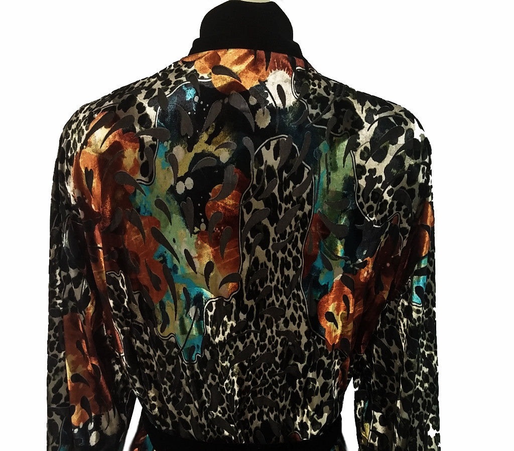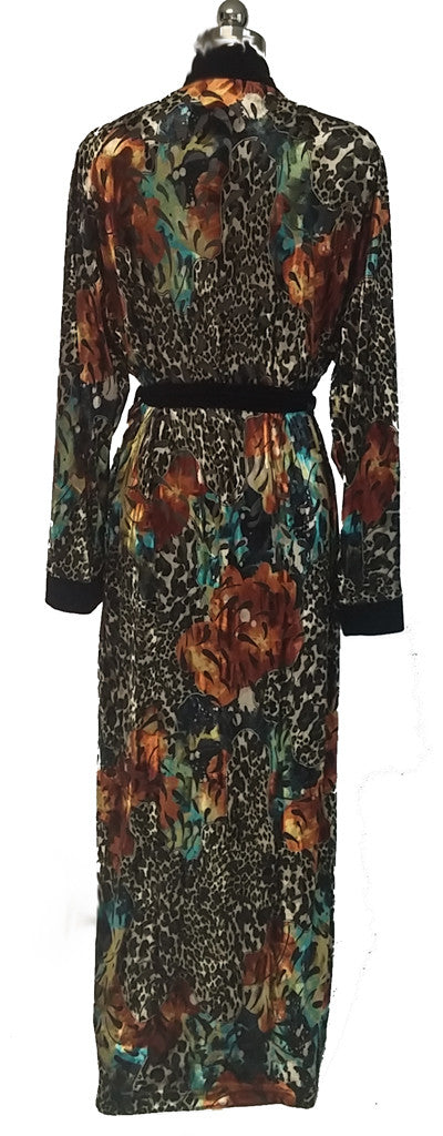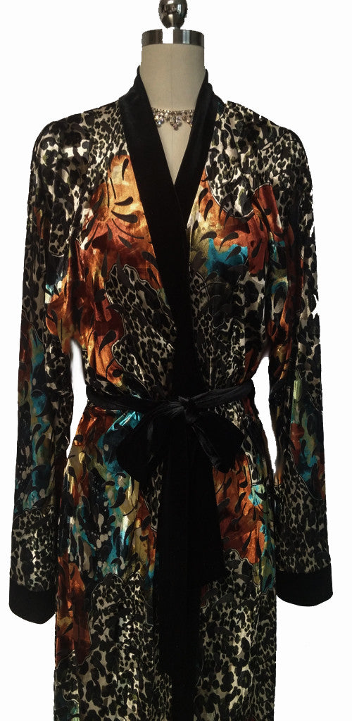 A very rich and lush looking shade of glistening soft gold, black accents, rust, leopard & turquoise in this wrap robe. Wide black velvety velour trim around the neckline and ends of sleeves for a luxurious look. The robe is a medium weight, not too light like a poly fabric but not too heavy either. Two front pockets with inside ties for a good fit. Matching black velvet velour tie with loops on robe.