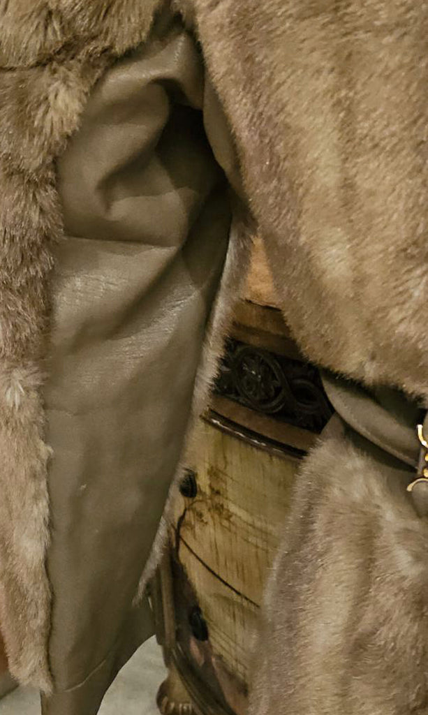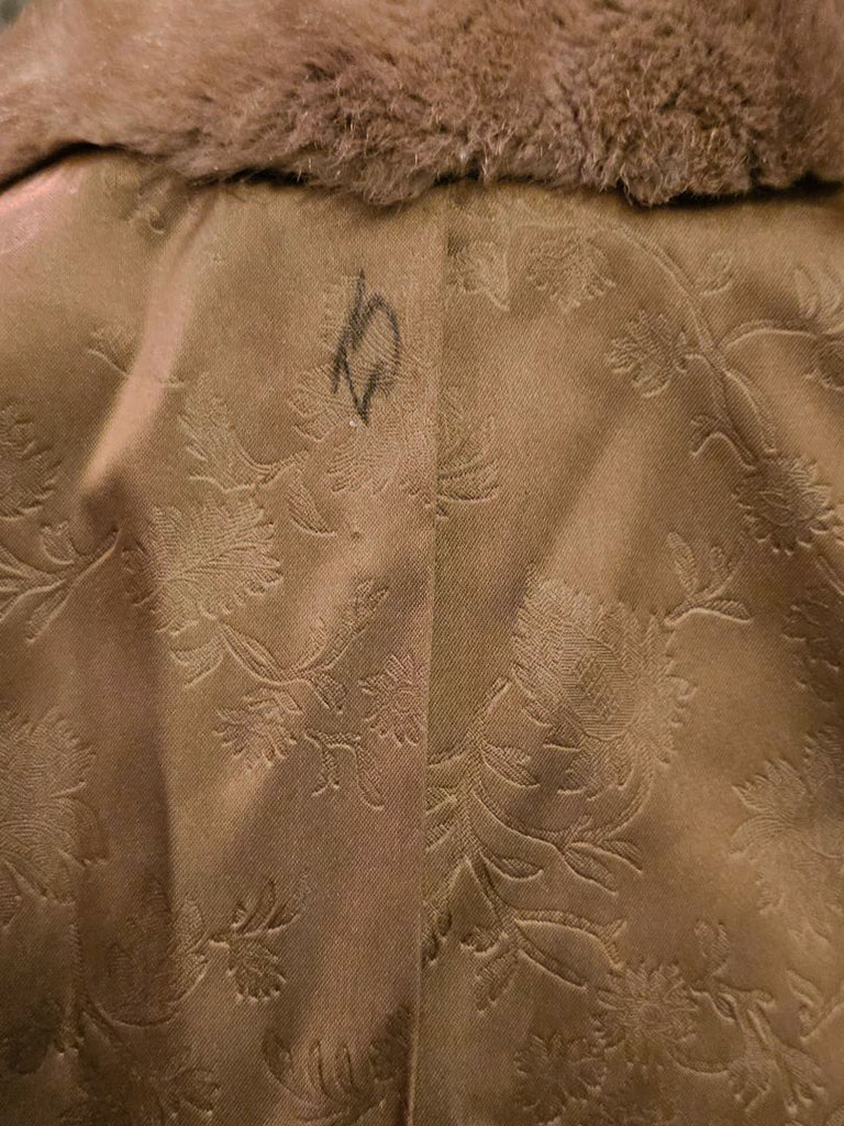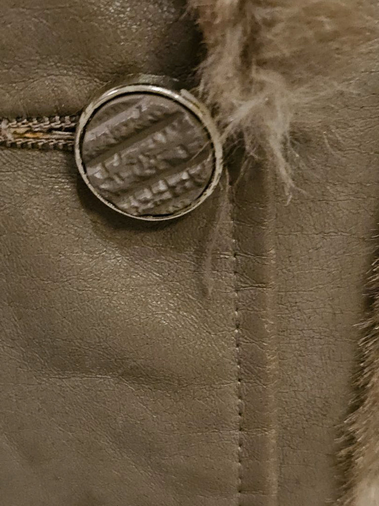 VINTAGE 60S TISSAVEL FAUX FUR LEATHER COAT BRONZE SATIN GOLD BUTTONS BELTED