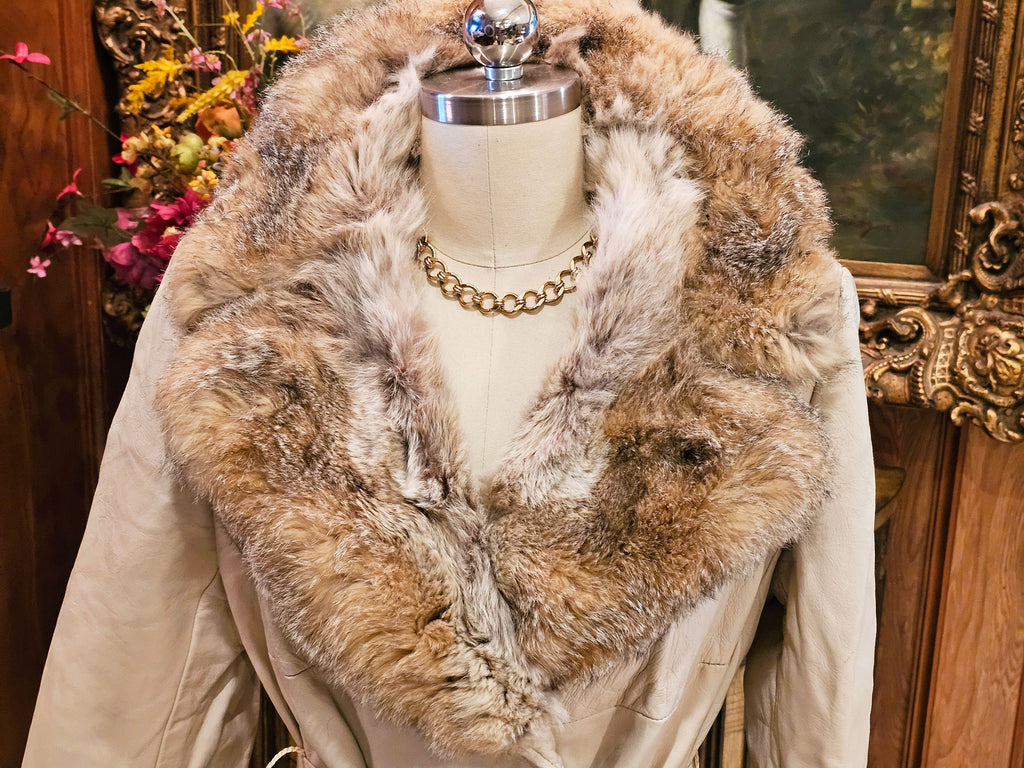 1960s -1970s era. This sophisticated beige leather piece features a genuine fur collar (not sure what the fur is as I am not a fur expert) and wide fur-trimmed hem, side pockets, and a matching belt for a flattering silhouette.