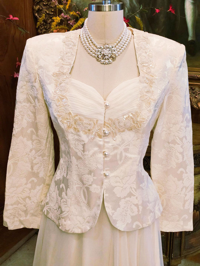 Crafted in luxurious ivory brocade with substantial weight and beautiful texture, this stunning jacket showcases elaborate miniature pearl and clear sequin appliqués throughout the bodice—some appliques measuring up to 2-1/2" across for dramatic impact. The modified sweetheart neckline features horizontal wide ruched chiffon-like nylon that creates romantic texture and visual interest.