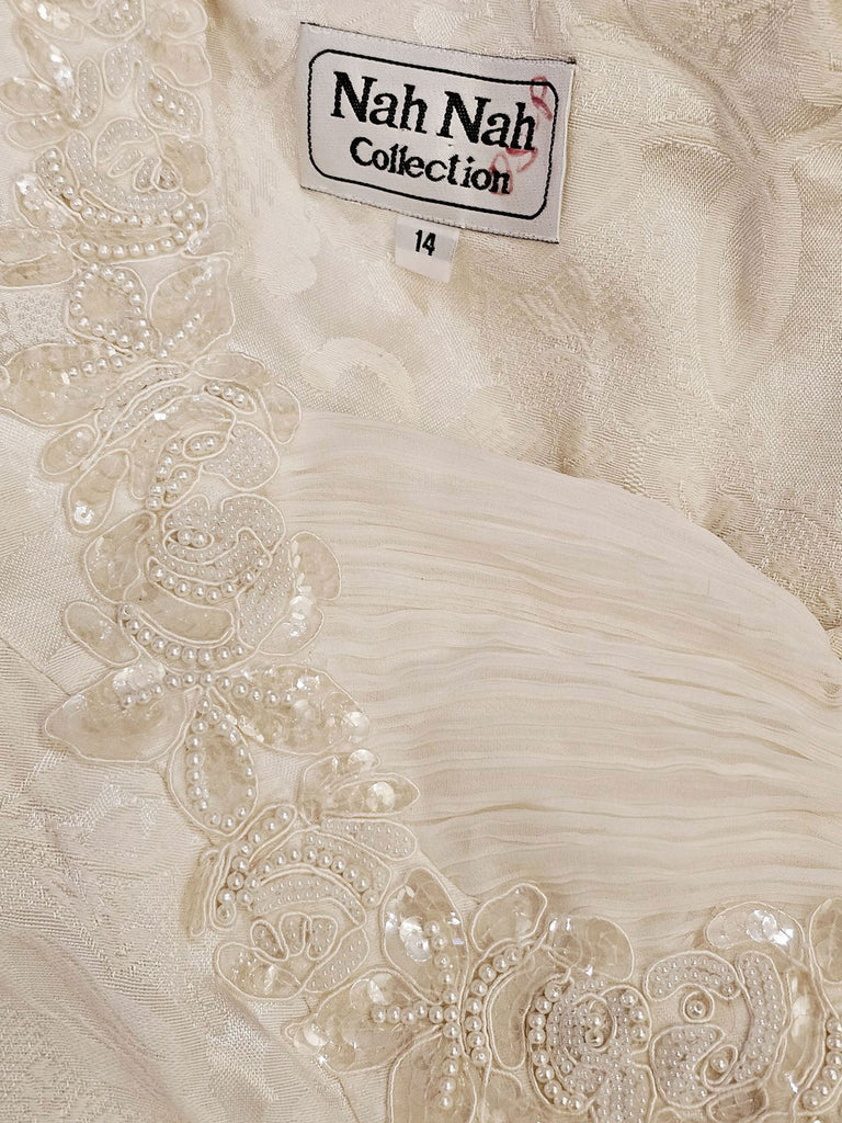 Exquisite vintage 1980s two-piece evening ensemble by Nah Nah Collection featuring an ivory brocade jacket with spectacular pearl and sequin appliqués paired with a flowing floor-length nylon chiffon skirt. This breathtaking set exemplifies the glamorous, opulent styling of 1980s formal wear.