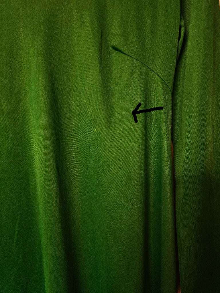 Condition: Very good - there are approximately 4 small light spots under the bustline that are minor and barely noticeable when worn. A few dots of green ink would probably fix that. (Last 2 photos)