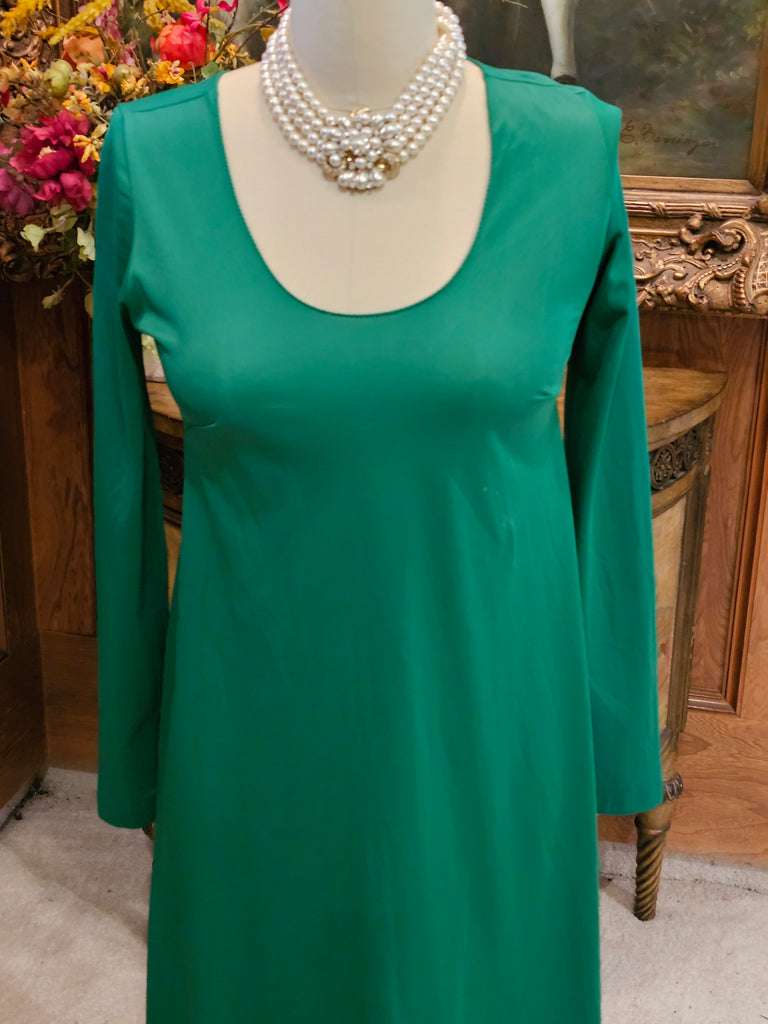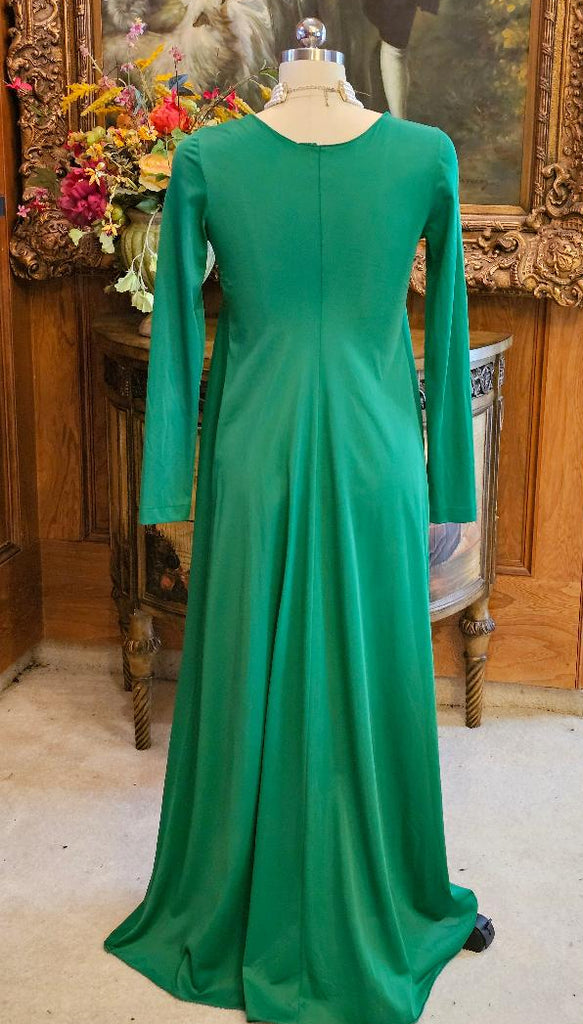 VINTAGE EMERALD GREEN BIAS CUT NIGHTGOWN SILKY NYLON LONG SLEEVE SCOOP NECK