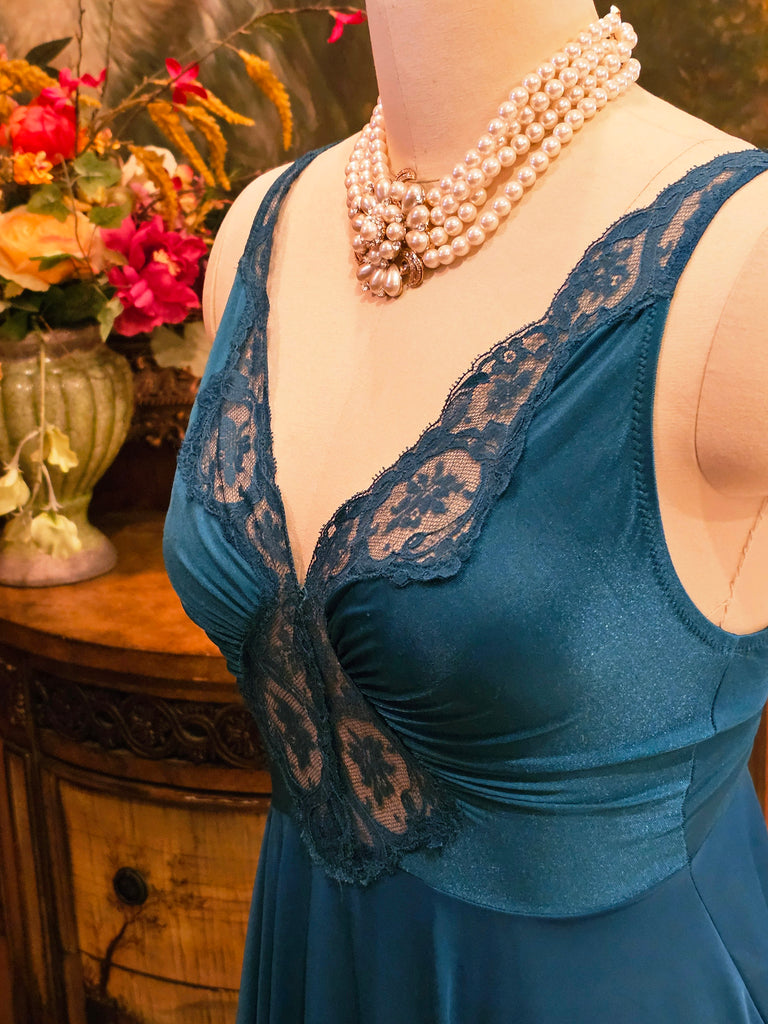 A fabulous vintage Olga Bodysilk spandex lace nightgown in a beautiful and unique shade called Sea Dragon perfect for Fall and Winter.