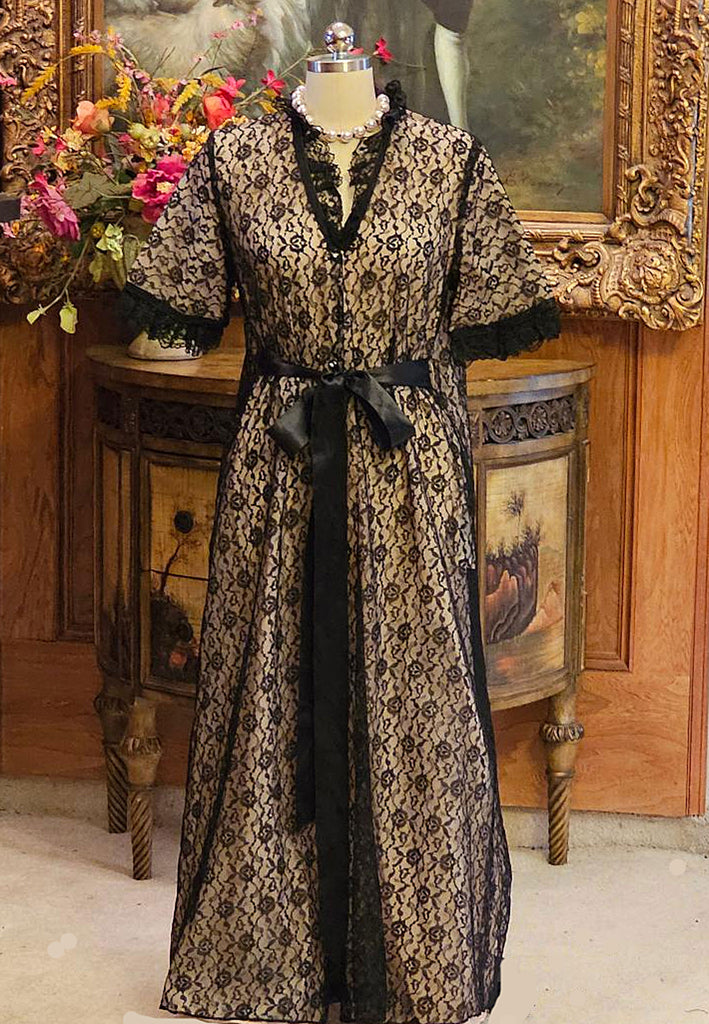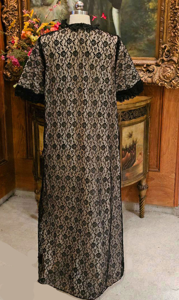 Crafted entirely in luxurious black floral lace with meticulous attention to detail and quality. The robe is beautifully lined throughout with pale pink organza creating a striking contrast against the black lace while maintaining modest coverage. The construction features no exposed seams — a hallmark of quality vintage craftsmanship that creates a refined, polished finish inside and out.