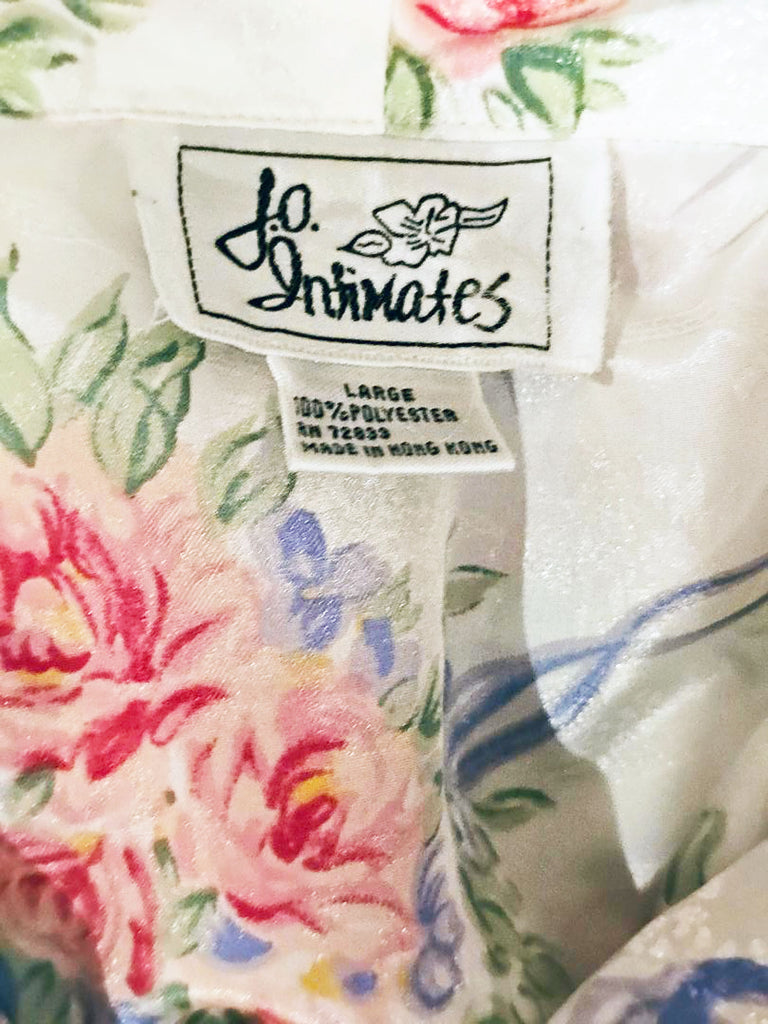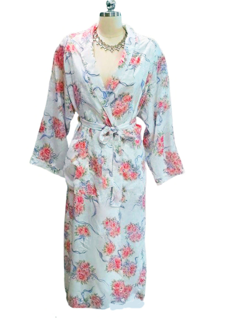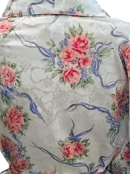 VINTAGE L. A. INTIMATES SILKY SHIMMER WRAP PEIGNOIR ROBE ROSE BOUQUETS TIED WITH PERWINKLE RIBBONS GLAMOROUS SIZE LARGE