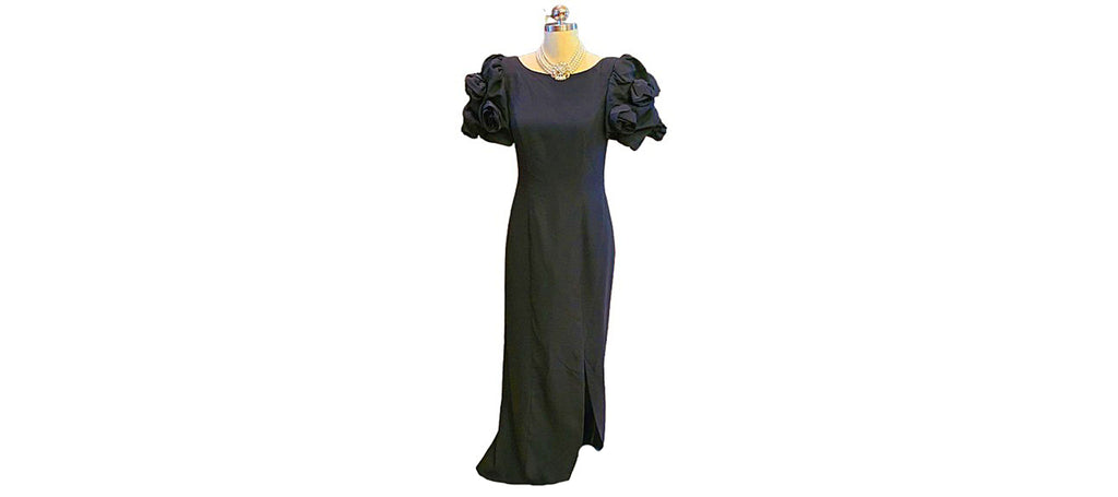 VINTAGE JACK BRYAN LORD & TAYLOR '80s-'90s BLACK EVENING GOWN FABRIC ROSE SLEEVES VERY BEAUTIFUL & DRAMATIC