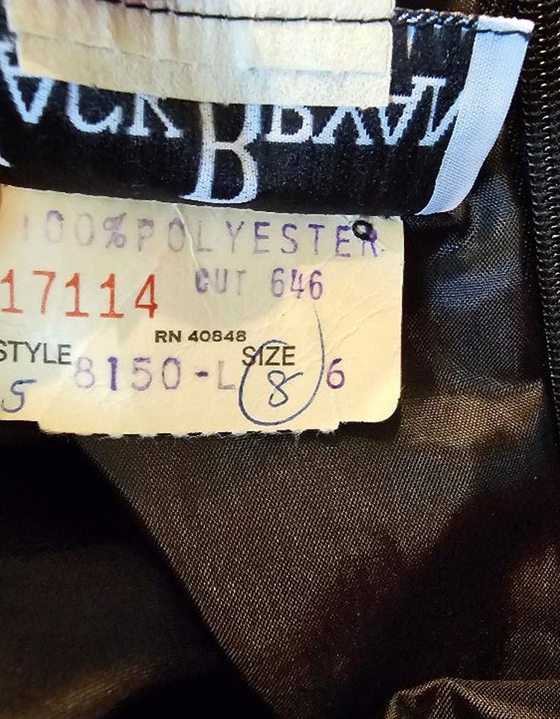 Fully lined in black satin with no exposed seams. Zipper in back as well as zipper at the end of the sleeve for a formfitting fit. Vintage pinked seams on the lining inside the dress. 26” slit in side of dress for ease in walking.
